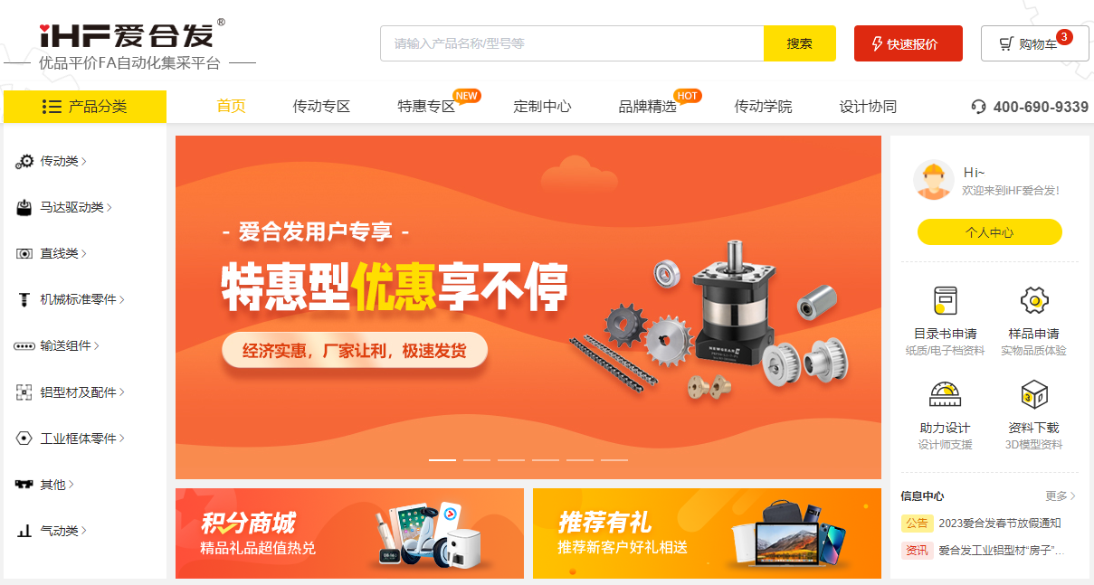 iHF愛合發(fā)FA自動化集采平臺主要銷售“自產(chǎn)”“優(yōu)選”兩大系列工業(yè)標(biāo)準(zhǔn)零部件,平臺以“助力工程師選型”為己任,以“工業(yè)智造,國品之光”為發(fā)展目標(biāo),以“愛多好快省”為經(jīng)營理念,打造集生產(chǎn)、展示、購買、服務(wù)、交流為一體的“優(yōu)品平價”綜合性工業(yè)品互聯(lián)網(wǎng)平臺。